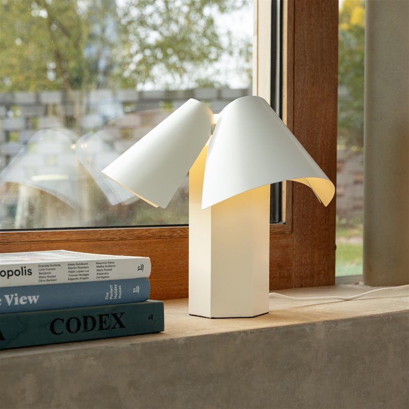 Beln is a truly distinctive table lamp. A metal-bent beauty that unites a precise, hexagonal base with three softly curved lampshades. Its bonbon-like apperance is almost sculptural, a small character that instantly draws the eye.