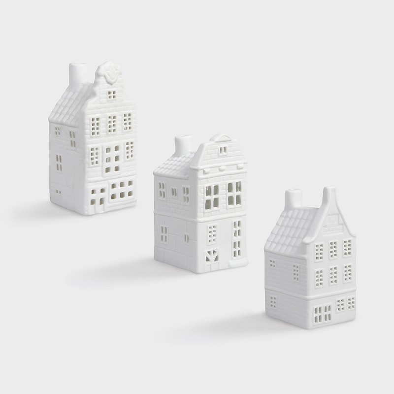 Bring Amsterdam into your living room with these canal houses made of porcelain. Suitable for one tealight. This set consists three different designs, all separate in a gift box.