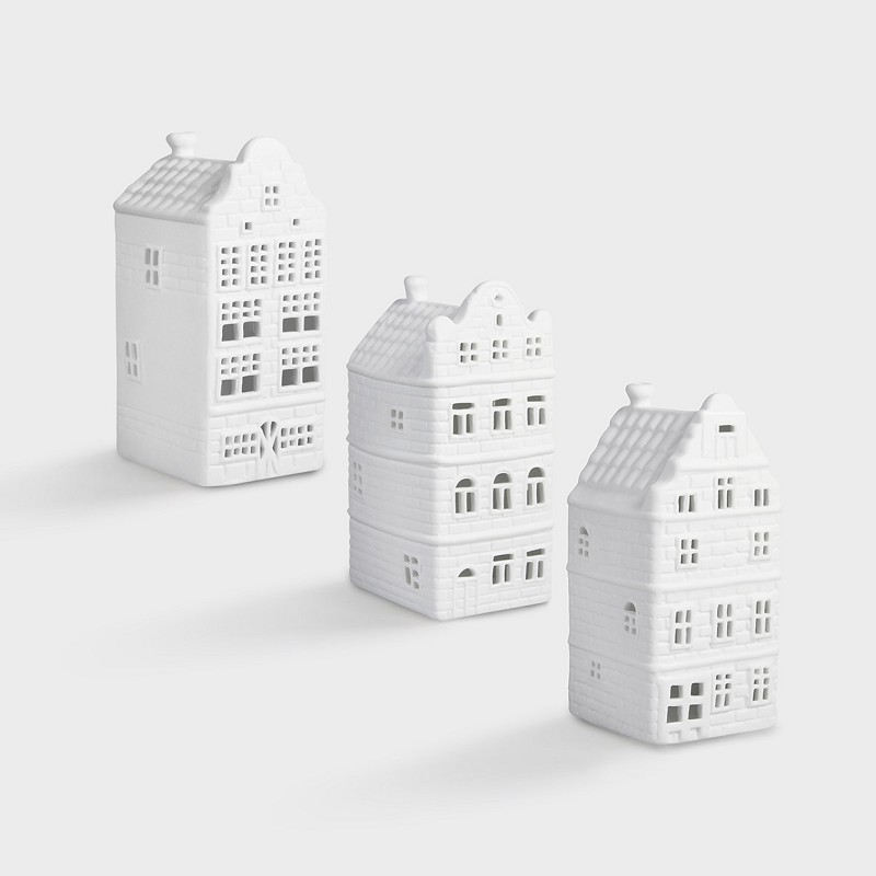 Bring Amsterdam into your living room with these canal houses made of porcelain. Suitable for one tealight. This set consists three different designs, all separate in a gift box.
