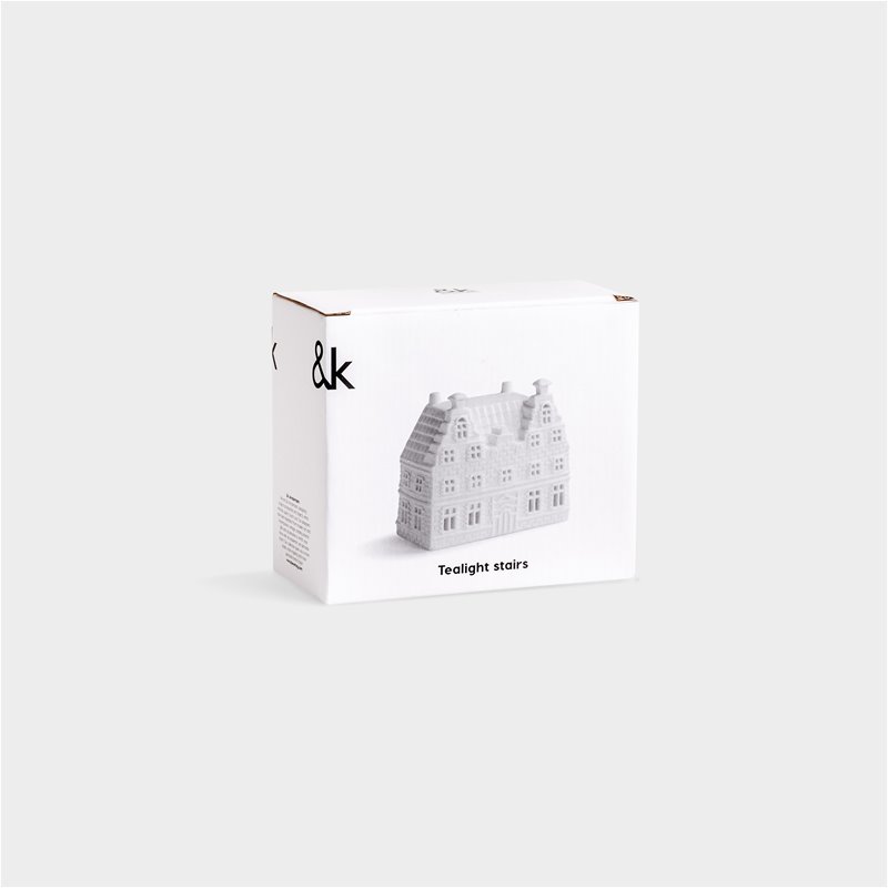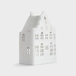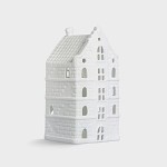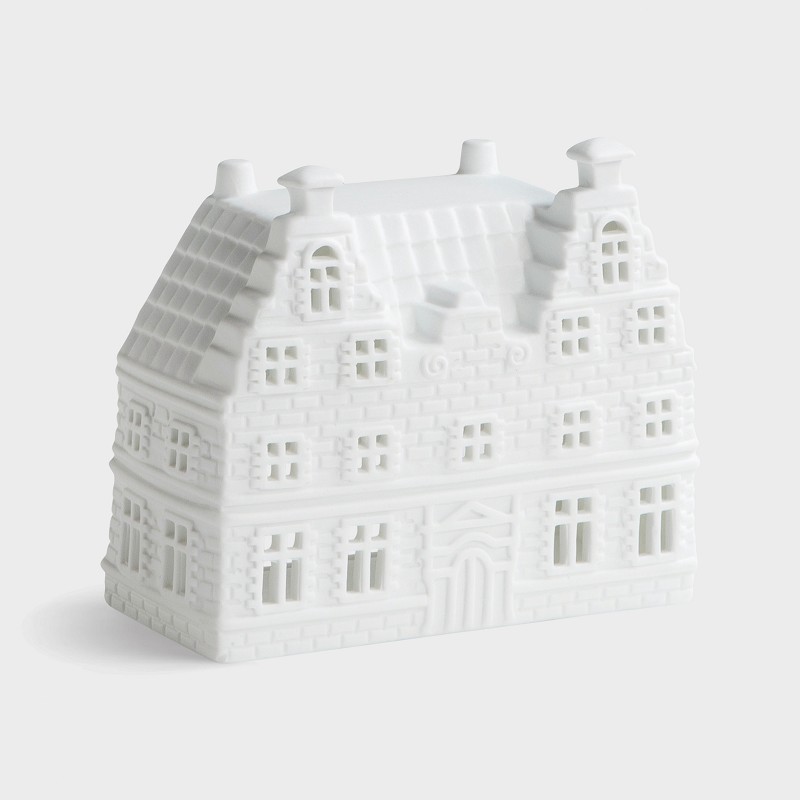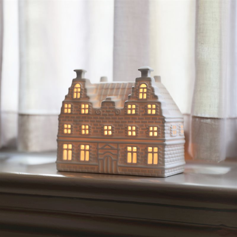 This Duo Large porcelain tea light holder features two beautifully detailed canal houses side by side, inspired by classic Dutch architecture. Crafted from delicate white porcelain, the tealight comes to life when lit from within, casting a warm and inviting light through its tiny windows.