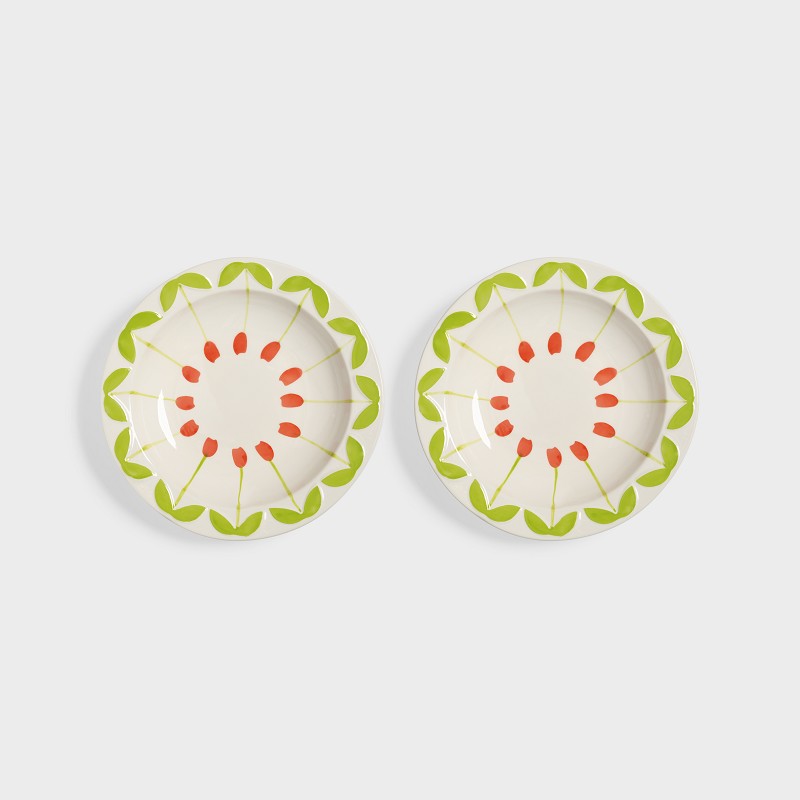 The tulip painting along the rim adds a cheerful note to these large, deep bowls. What makes them truly unique is the pattern that emerges when they are combined with other pieces from the same collection. Each bowl features a distinct design that, when paired with the other plates and bowls, forms a harmonious folk pattern, creating a visually appealing set on the table.